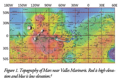Figure 1 shows a map of a portion of the surface features of Mars. The red regions are at high elevations and the blue are in the lowlands. Note that Valles Marineris originates on the edge of a large crater and what appear to be flow features are present in the channel east of the canyon. Volcanic mountains are present west of the canyon and small craters occur over the entire surface. These craters are thought to have been formed as a result of asteroid and meteor impacts. The surface was also disrupted by volcanism and lava flows. Large amounts of liquid on the surface or in the crust were involved in these events. It is clear that major catastrophic processes have occurred on Mars in the past.1