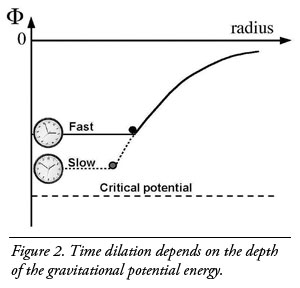 The new metric (solution of Einstein’s gravity equations) Humphreys developed to describe the relationship among mass, space, and time says that the distribution of mass controls the fabric of space, the fabric of space controls the speed of light, and the speed of light controls time.4 Time is speeded up or slowed down throughout space according to the distribution of mass. Figure 2 shows the relative speed of clocks as a function of gravitational potential energy and distance from the center of the cosmos where the initial mass was created. Notice that potential energy is always negative except at an infinite distance from the center of the cosmos. Also, notice that time slows down at lower potential energy until a critical value is reached. This value called the critical depth is the level below which time itself stops. This condition without time is called the achronous (no time) region.