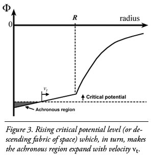 Let’s suppose the tension in the fabric of space suddenly decreased enough to make the critical potential move upward rapidly. Then, the sphere of timelessness would have expanded faster than otherwise. The speed vt of its expansion (or later, contraction) depended on three factors: the inverse of the radial slope of the potential for the fabric of space, the rate of the potential’s descent or rise, and the rate of rise or descent of the critical potential level. Other scenarios are possible, so the reader should take this as only an example of the possibilities that achronicity opens up.