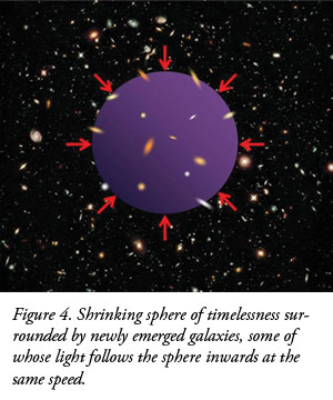 it resumed emitting light. Some of the emitted light would have gone inward toward the center. Because the timeless sphere was moving inward at the speed of light, the inbound light would follow right behind the sphere as it shrank (see Figure 4). When the sphere of timelessness reached zero radius and disappeared, the earth emerged, and immediately the light that had been following the sphere reached earth, even light that started billions of light years away. The stretching of the fabric of space had been occurring continuously all along the light trajectory, thus red-shifting the light wavelengths.
