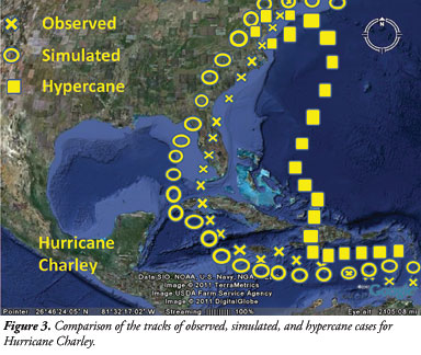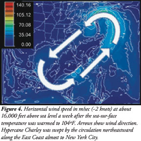 This researcher previously simulated the development of Hurricane Florence (1988) in the Gulf of Mexico and found that warm sea-surface temperatures caused the storm to grow from a weak hurricane into a hypercane.1 Figure 2 shows the simulated hypercane that developed one day after the sea-surface temperature was increased to 104ºF. Hypercane Florence formed deep convection, dramatically increased its rate of rotation, quadrupled its vertical and horizontal winds, and increased its precipitation rate to ten times that of the actual hurricane. Hypercane Florence followed the same track as the actual Hurricane Florence northward across the Gulf of Mexico from the Yucatan Peninsula to New Orleans. However, the simulation of Charley under similar conditions demonstrated that its track was completely different from the original hurricane. Figure 3 shows a comparison of the observed, simulated, and hypercane tracks for Charley.