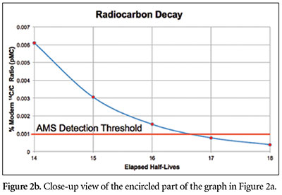 Sensitive instruments called acceleration mass spectrometers (AMS) are used to count the 14C atoms within a sample of material. However, even the most sensitive AMS machines cannot detect fewer than one 14C atom per 100,000 trillion carbon atoms.1 Since the amount of 14C in a sample decreases with time, no radiocarbon at all should be detectable if the sample is sufficiently old.