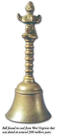 The most startling such evidence is human artifacts, such as the bronze bell shown here. It was encased in a large piece of coal. Standard dating of the bituminous coal seam from which it was taken dates it from the Carboniferous Period, approximately 300 million years old. Certainly no human artifact could reside in such "ancient" strata. This "fossil" is anomalous indeed.