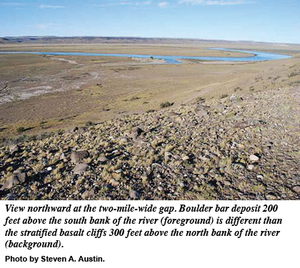 Large boulders occur on top of the basalt cliff on the north side of the river. Darwin described one as being 15 feet in diameter.2 According to Darwin, flowing water could not move such big rocks. Water, according to Darwin, could not sweep a boulder 300 feet above the present level of the modern river to the top of a cliff. Therefore, Darwin assumed the big boulder was dropped from a melting iceberg when an ocean stood over the basalt. Again, Darwin was significantly in error. The cobbles and boulders overlying the basalt at the cliff top are the spillover deposit accumulated rapidly when the flood exceeded the depth of the valley. Therefore, the colossal flood was likely 400 feet deep across the entire six-mile-wide valley!