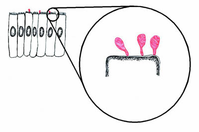 Figure 1. Diagram of mycoplasmas (red) infecting epithelial cells (black). The mycoplasmas form a small structure called a "tip" by which they adhere to the epithelial cells. If the mycoplasmas are prevented from adhering to the epithelial cells, they are avirulent. |