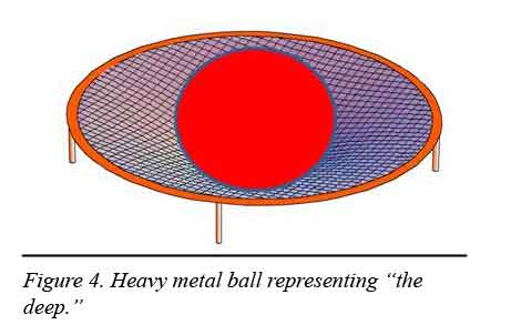 Now, replace the ring on our trampoline with a heavy metal ball to represent “the deep.” The ball would make a large dent in the fabric. The slope of the fabric around the ball is steep, meaning gravity would be strong around “the deep.” Conditions would be complicated, and probably beyond our present understanding of physics. But, we can say that almost certainly time dilation was taking place. One ordinary-length day of time passed during which time the ball would have contracted due to gravity. But, the speed of light would limit its contraction to a few percent of the overall diameter.16