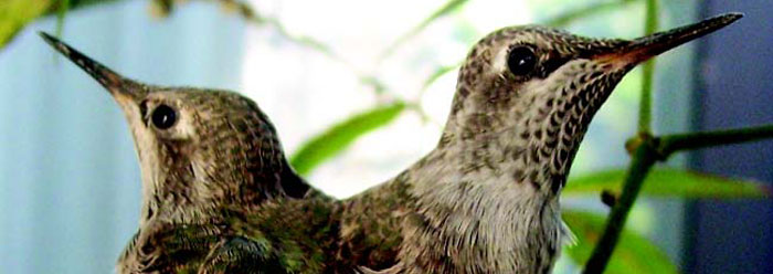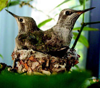 The staff at ICR trusts you enjoy the hummingbird picture taken outside a window of our main building. It was noticed months ago that an adult bird was weaving a nest on a palm frond. Being a science organization and lovers of God's living creation, we closely followed the maternal events as they unfolded. The tiny eggs hatched and in due time, the two rapidly-growing hatchlings were literally bursting from the confines of their nest. It was interesting that the mother, perched on a nearby branch (always the same one), would intently watch her little ones in the nest. She would occasionally zoom around the nest, showing her crouching, bewildered offspring that "this is how you do it!"