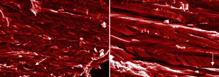 “The detail revealed by TEM [transmission electron microscopy] imaging unequivocally identifies the organic remains as fossilized musculature from the salamander itself.”2 Its body was outlined with a carbon tracing, indicating that it had been heated. The researchers noticed that some of the cracks between the fiber bundles were wider than those of modern specimens. These cracks most likely formed as the salamander flesh dried out, possibly from this heating event. The study also noted that the tissue preservation occurred in “the absence of protective encapsulating agents such as bone” or amber.2