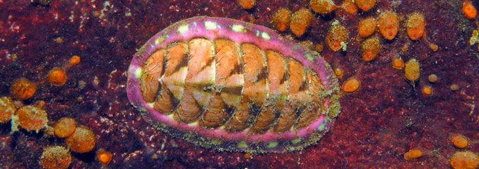 Chitons scour intertidal rocks for algae meals. Eight integrated shell-plates cover their backs, and a muscular foot allows them to cling with surprising strength to the rocks they traverse. A recent study explored their unique dual-mode eye design. How do they see in both air and water without switching out eye lenses, and is this an "adaptation," as suggested in a summary in ScienceNOW?1