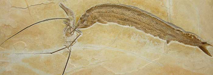 The flying reptile, a Rhamphorhynchus pterosaur discovered in the famous Solnhofen Limestone in southern Germany, had apparently been skimming the water surface when a large extinct fish called an Aspidorhynchus caught its wing. The violent scene seems similar to Native American legends of flying reptiles.