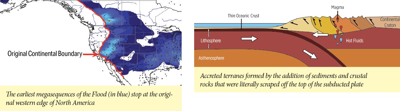 In the process, pieces of small continents, ocean sediments, and possibly islands embedded in the ocean crust were scraped off the subducting ocean crust, leaving behind or accreting 120- to 250-milewide belts of rock. These were added to the edges of the continents during the Flood year, literally as the “rug was pulled out from underneath it.” Each terrane has a completely different geology compared to the adjacent terrane.