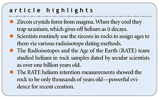 With these concepts in mind, we will look at the experimental investigation initiated by Dr. Russell Humphreys and his colleagues on the Radioisotopes and the Age of the Earth (RATE) team into retention of helium atoms in a supposedly 1.5 billion-year-old rock.3 The granitic rock from which the zircon crystals used in these studies came was classified as biotite granodiorite, an igneous rock.4