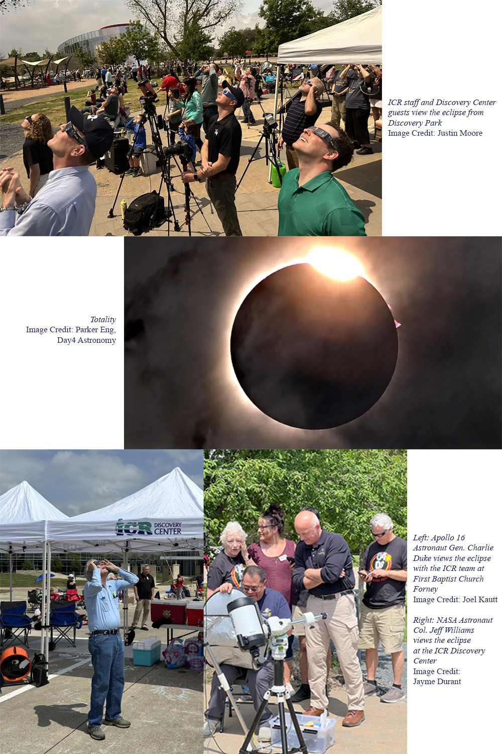 The skies cleared above North Texas on Monday, April 8, for a spectacular view of the 2024 Great American Solar Eclipse. Hundreds of guests joined the Institute for Creation Research to witness this incredible sight at First Baptist Church Forney and the ICR Discovery Center in Dallas, with several others from around the world viewing via ICR’s YouTube livestream. While totality only lasted about four minutes, the day was filled with celebration alongside ICR scientists, Apollo 16 astronaut Gen. Charlie Duke and his wife, Dotty, NASA astronaut Col. Jeff Williams, former NASA engineer Cathryn Sterling, and several astronomy enthusiasts.