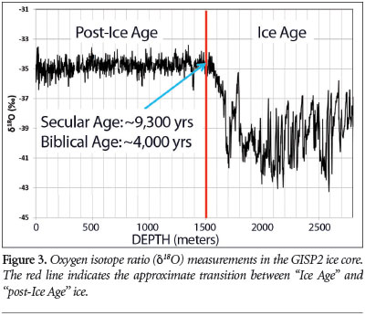 In the creation-Flood model, the post-Flood Ice Age was a relatively short event, probably lasting about 700 years.12 Since the Flood occurred around 2500 B.C., the Ice Age would have ended roughly 4,000 years ago. Based on δ18O measurements within the GISP2 core, warmer temperatures seem to be fairly constant at depths above 1,500 meters (Figure 3). If this 1,500-meter depth corresponds to the end of the Ice Age, then the true age of the ice at this depth is roughly 4,000 years. However, secular scientists assign an age of about 9,300 years to this ice.13