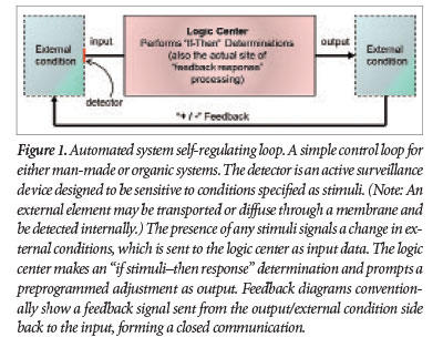 Automated system diagrams conventionally show a feedback signal sent from the output/external condition side of the process back to the input, forming a closed-communication, self-regulating loop (see Figure 1). Note that sometimes a measurable signal is sent back to the logic center. More often, the output simply changes the external conditions, which are continuously monitored by detectors, and the logic center self-adjusts the entity accordingly—i.e., the feedback step.
