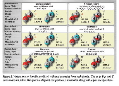 All mesons are unstable.12 They are created during high-energy collisions and then promptly decay into other particles in a fraction of a second. The longest-lived mesons (the pions and kaons) last only 10 to 50 nanoseconds—a nanosecond is one billionth of a second! The heavier mesons tend to decay into various combinations of pions, which then decay into muons, neutrinos, or photons. Figure 2 shows a list of some of the more common mesons and their properties.
