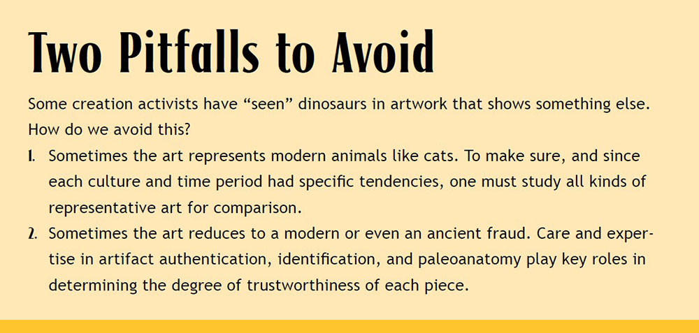 Creation speaker and author Vance Nelson has vetted many dragon artifacts. One of the steps he uses to verify ancient art is to compare it with digital renders (an artist’s computer-generated images) based solely on fossil anatomy. Vance employs an evolutionary paleoartist who unwittingly ends up painting images that match the ancient art. I relied on Vance’s book Dire Dragons when helping design our Dragon Encounters wall.2 His book shows ancient images of dinosaur look-alikes, plus extinct reptiles that weren’t dinosaurs but whose remains were found in Triassic and even Permian settings.