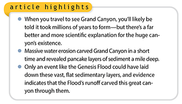 Today’s processes do not form broad, flat rock layers or carve such big and clean canyons. Different processes must be responsible—catastrophic processes. Therefore, it’s reasonable to conclude that early floodwaters laid down Grand Canyon rocks while the water was rising, and the receding floodwater carved most of the Canyon.