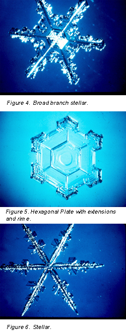 function of temperature. Molecules from the surrounding vapor that land on a growing crystal migrate over its surface and are fixed to either the axial or basal planes depending upon four temperature conditions. For example, snow crystals will grow lengthwise to form long, thin needles and columns like Figures 1 and 2 when the temperature is between about -3°C and -8°C. When the temperature is between about -8°C and -25°C, plate-like crystals will form as shown in Figures 3 through 10. Beautiful stellar and dendritic crystals form at about -15°C. In addition, the relative humidity of the air and the presence of supercooled liquid cloud droplets will cause secondary growth phenomena known as riming and dendritic growth. The small, dark spheres attached to the edges of the plate in Figure 5 are cloud droplets that were collected and attached to the snow crystal as rime as the crystal fell through these droplets on its way to the earth's surface. The dendritic and feathery edges of Figures 6 through 10 are produced by the rapid growth of snow crystals in a high-humidity environment.