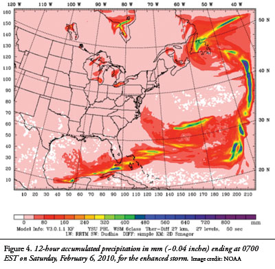 Figure 4 shows the 12-hour accumulated precipitation ending at 0700 EST on Saturday, February 6, for the enhanced February 5-6, 2010, North American blizzard. Most of the heaviest precipitation occurred far off the east coast in the Atlantic, where the storm dynamics were the strongest. The accumulated precipitation exceeded 40 inches of water equivalent per 12 hours over several locations of the ocean and about two inches over most of the domain, except in the southern states and the northern part of the Gulf of Mexico. In addition, precipitation exceeded about four inches around Newfoundland, New Brunswick, and in the ocean just south of Maine. The counterclockwise circulation around this enhanced storm also extended to long distances and produced snow streaks southward from Hudson Bay and the Great Lakes. The model calculations showed that over 20 inches of snow would have fallen during 24 hours in Canada and the northeastern United States. Two other typical nor’easters were successfully simulated in this study and produced similar results to the February 5-6, 2010, blizzard described previously.