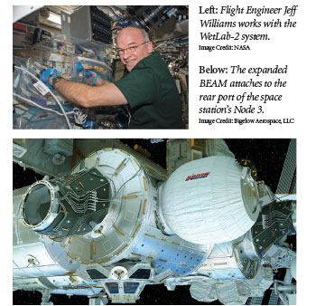 Astronauts will need adequate living and laboratory space while on the Red Planet. Habitats should be lightweight and easy to build, and they must perform in microgravity and the vacuum of space. They also need to protect against solar radiation and space debris. A new structure called the Bigelow Expandable Activity Module (BEAM) appears to be a solution.2 “Expandables” take up less precious room on a rocket but once expanded provide greatly enhanced living and working space. The capsule connects to the ISS and expands to a 13 x 10.5-foot compartment. Crew members will monitor the module’s material and design during its two-year test mission.