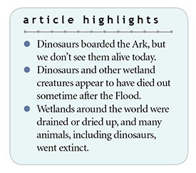 What happened to dinosaurs and many other wetland creatures after the Flood? They probably died out as each region dried.