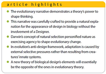 Every assumption of evolutionary theory has been carefully selected to play a part in providing a non-theistic account of why creatures look designed. The narrative is characterized by inherent anti-engineering elements to shape people’s thinking that nature alone is sufficient to produce the appearance of design in creatures. Whether God intervened or not is superfluous.