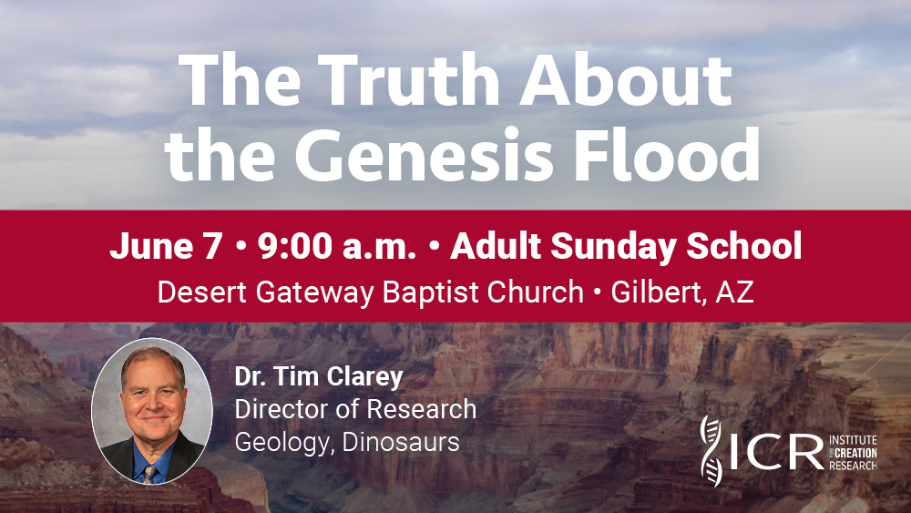 Join ICR’s Director of Research Dr. Tim Clarey as he speaks on geological evidences for the Genesis Flood at Desert Gateway Baptist Church in Gilbert, AZ on Sunday, June 7th, 2026.