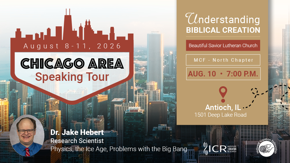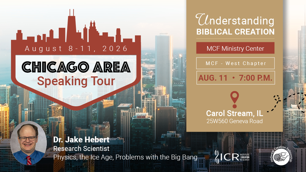 Join ICR's Dr. Jake Hebert as part of the Chicago Area Speaking Tour sponsored by Midwest Creation Fellowship as he speaks at MCF's North Chapter Meeting on the evening of Monday, August 10th, 2026.