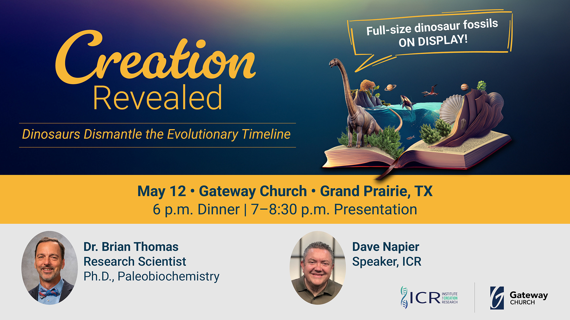 Join us the evening of March 18th, as ICR's Mr. Dave Napier shares on the evidence of dinosaurs and where they fit within the biblical timeframe at First Baptist Church of Wichita Falls, TX.