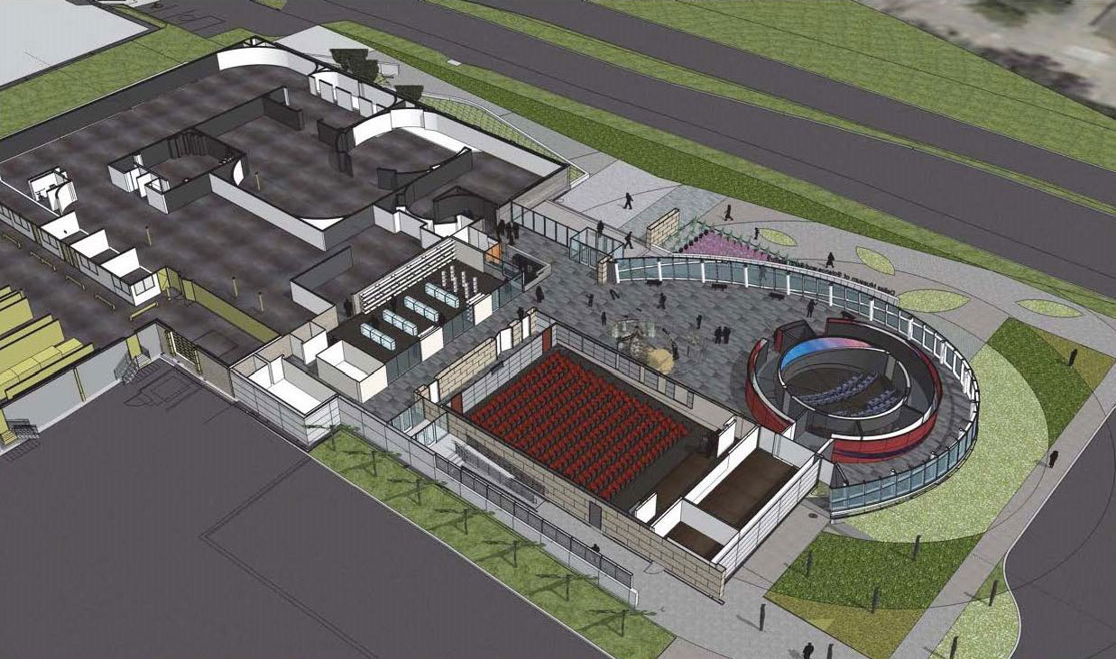 Aerial view from the north east showing outdoor park, Planetarium pavilion, and Exhibit Hall