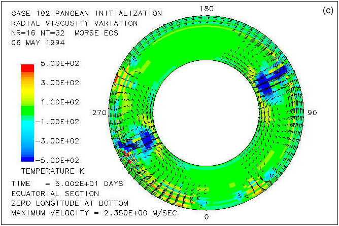 Figure 3. Initial conditions for 3-D calculation. (a) Initial plate boundaries represent present continents mapped to their approximate Pangean locations. Blue regions represent thermal anomaly 400 K colder than reference temperature at a depth of 100km. (b) Cross section through equatorial plane viewed from the north pole displaying deviations from the reference temperature. Temperature perturbations representing incipient subduction have a depth extent of 400 km. |